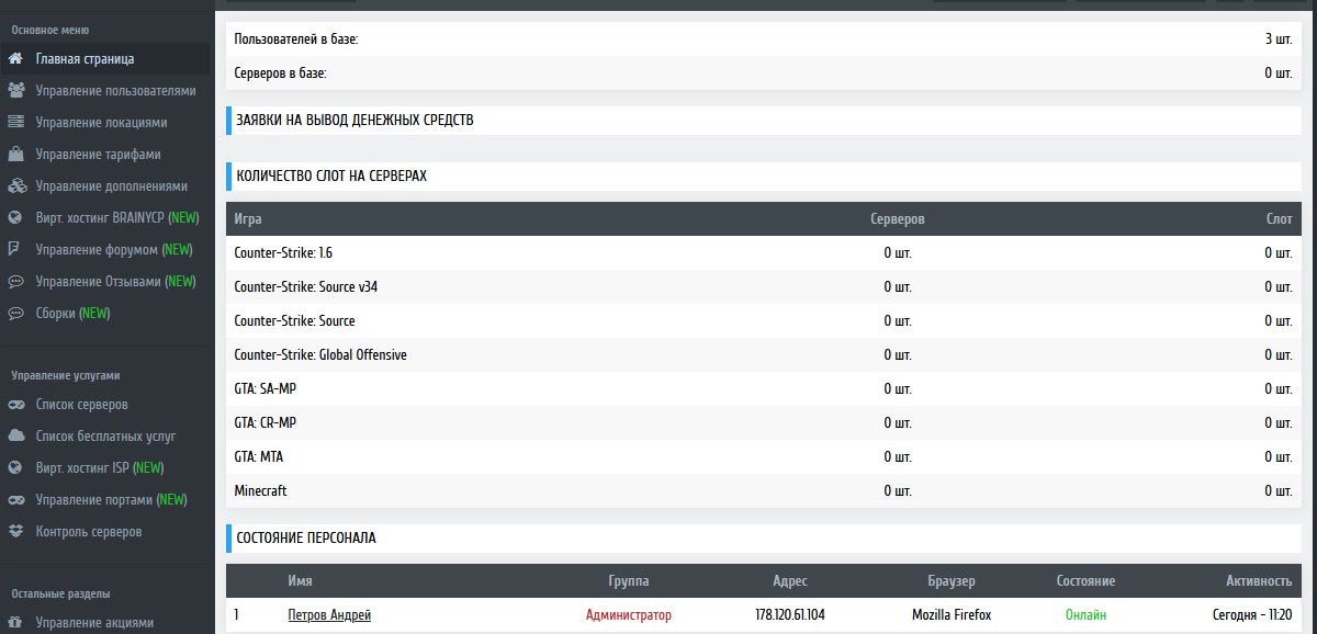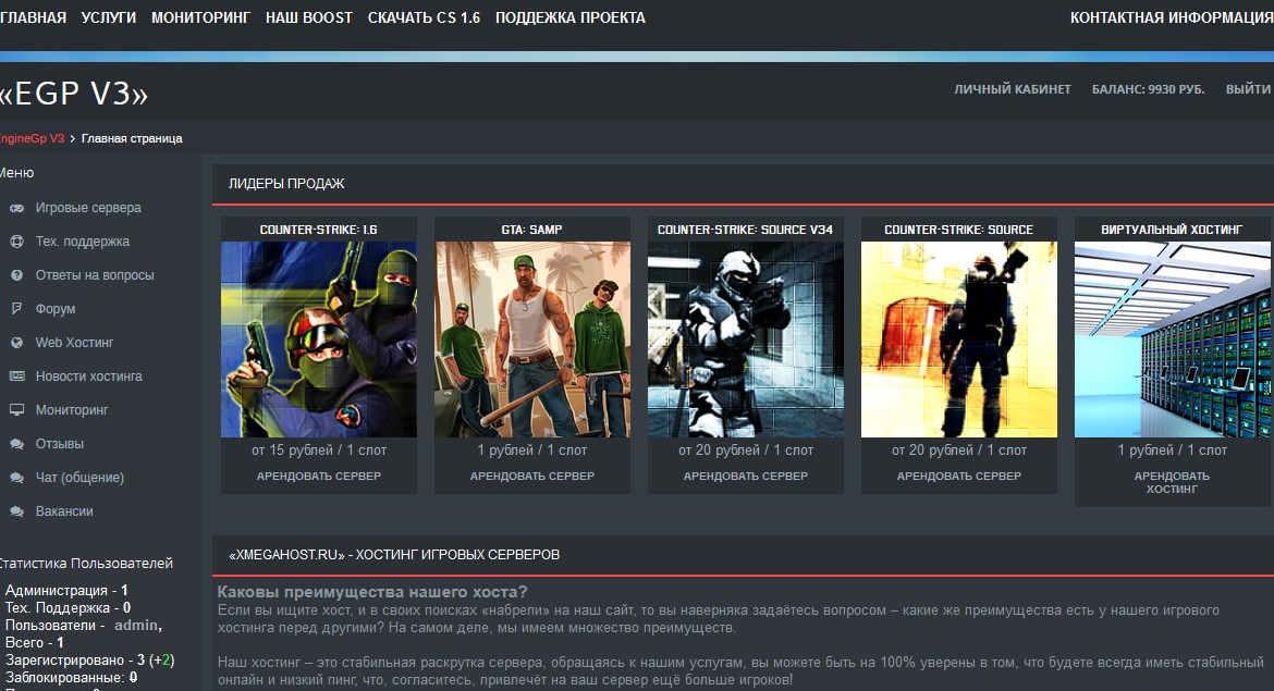 Панель управления хостингом игровых Серверов - EGPV3. это обновлённая и доработанная оригинальная версия EngineGamePanel v3 с которой вы можете с лёгкостью открыть многофункциональный проект или просто запустить игровой сервер, общаться в чате, подключать vds к панели, загружать сборки с яндекс диска. Устанавливать WEB МОДУЛИ (CSBANS, AMXBANS, ASTATS, CSSTATS, Buy Privileges) и многое другое